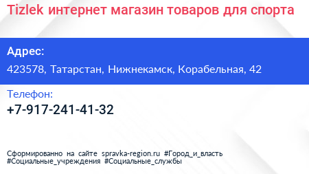Tizlek, интернет-магазин товаров для спорта по адресу 423578, Татарстан, Нижнекамск, Корабельная, 42 в дальнейшем Организация, размещена в следующих категориях: