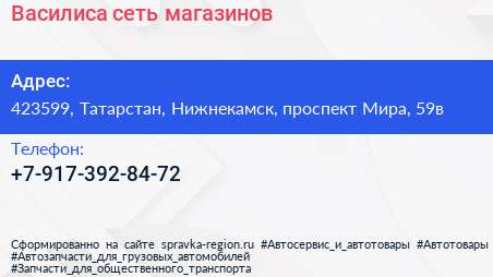 Василиса, сеть магазинов по адресу 423599, Татарстан, Нижнекамск, проспект Мира, 59в в дальнейшем Организация, размещена в следующих категориях: