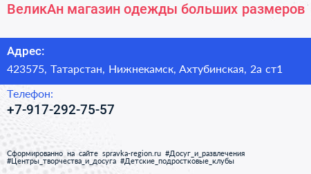 ВеликАн, магазин одежды больших размеров по адресу 423575, Татарстан, Нижнекамск, Ахтубинская, 2а ст1 в дальнейшем Организация, размещена в следующих категориях:
