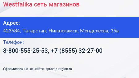 Westfalika, сеть магазинов по адресу 423584, Татарстан, Нижнекамск, Менделеева, 35а в дальнейшем Организация, размещена в следующих категориях:
