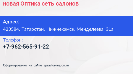 новая Оптика, сеть салонов по адресу 423584, Татарстан, Нижнекамск, Менделеева, 31а в дальнейшем Организация, размещена в следующих категориях: