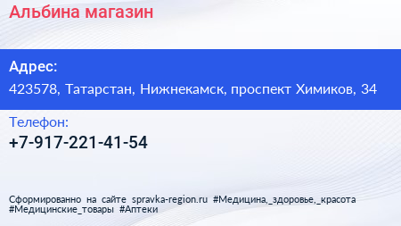 Альбина, магазин по адресу 423578, Татарстан, Нижнекамск, проспект Химиков, 34 в дальнейшем Организация, размещена в следующих категориях: