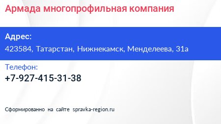 Армада, многопрофильная компания по адресу 423584, Татарстан, Нижнекамск, Менделеева, 31а в дальнейшем Организация, размещена в следующих категориях: