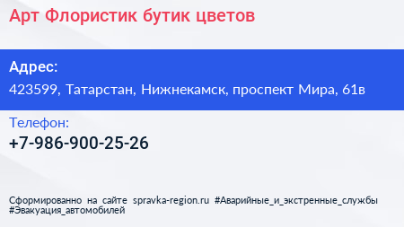 Арт-Флористик, бутик цветов по адресу 423599, Татарстан, Нижнекамск, проспект Мира, 61в в дальнейшем Организация, размещена в следующих категориях: