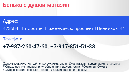 Банька с душой, магазин по адресу 423584, Татарстан, Нижнекамск, проспект Шинников, 41 в дальнейшем Организация, размещена в следующих категориях: