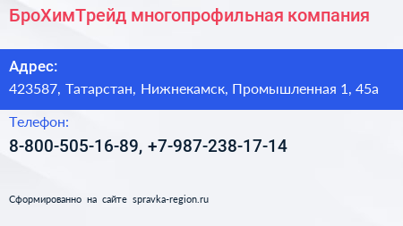 БроХимТрейд, многопрофильная компания по адресу 423587, Татарстан, Нижнекамск, Промышленная 1, 45а в дальнейшем Организация, размещена в следующих категориях: