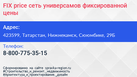 FIX price, сеть универсамов фиксированной цены по адресу 423599, Татарстан, Нижнекамск, Сююмбике, 29Б в дальнейшем Организация, размещена в следующих категориях: