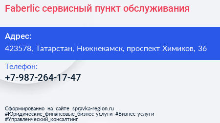 Faberlic, сервисный пункт обслуживания по адресу 423578, Татарстан, Нижнекамск, проспект Химиков, 36 в дальнейшем Организация, размещена в следующих категориях: