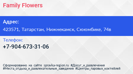 Family Flowers по адресу 423571, Татарстан, Нижнекамск, Сююмбике, 74в в дальнейшем Организация, размещена в следующих категориях: