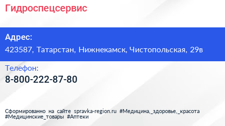 Гидроспецсервис по адресу 423587, Татарстан, Нижнекамск, Чистопольская, 29в в дальнейшем Организация, размещена в следующих категориях:
