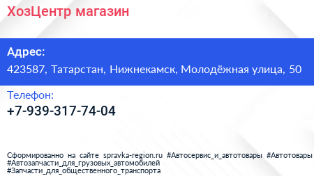 ХозЦентр, магазин по адресу 423587, Татарстан, Нижнекамск, Молодёжная улица, 50 в дальнейшем Организация, размещена в следующих категориях: