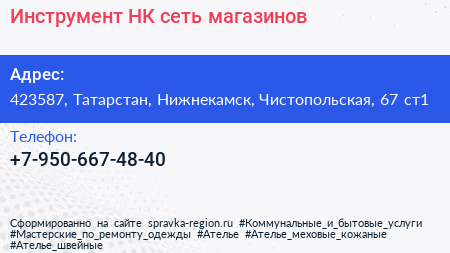 Инструмент-НК, сеть магазинов по адресу 423587, Татарстан, Нижнекамск, Чистопольская, 67 ст1 в дальнейшем Организация, размещена в следующих категориях: