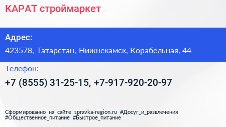 КАРАТ, строймаркет по адресу 423578, Татарстан, Нижнекамск, Корабельная, 44 в дальнейшем Организация, размещена в следующих категориях:
