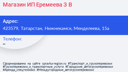 Магазин, ИП Еремеева З.В. по адресу 423579, Татарстан, Нижнекамск, Менделеева, 15а в дальнейшем Организация, размещена в следующих категориях:
