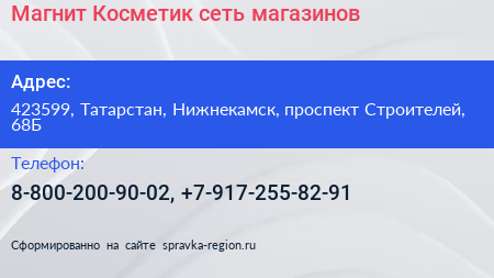 Магнит Косметик, сеть магазинов по адресу 423599, Татарстан, Нижнекамск, проспект Строителей, 68Б в дальнейшем Организация, размещена в следующих категориях: