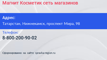 Магнит Косметик, сеть магазинов по адресу Татарстан, Нижнекамск, проспект Мира, 98 в дальнейшем Организация, размещена в следующих категориях: