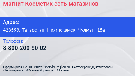 Магнит Косметик, сеть магазинов по адресу 423599, Татарстан, Нижнекамск, Чулман, 15а в дальнейшем Организация, размещена в следующих категориях: