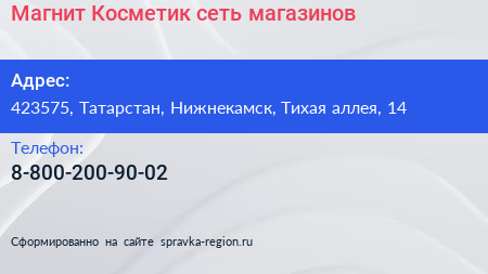 Магнит Косметик, сеть магазинов по адресу 423575, Татарстан, Нижнекамск, Тихая аллея, 14 в дальнейшем Организация, размещена в следующих категориях: