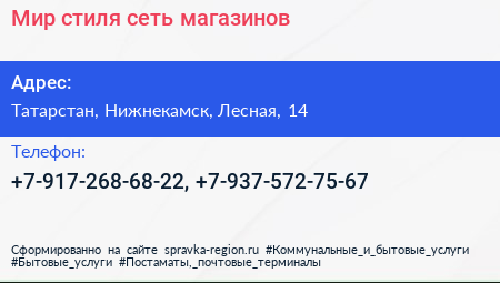 Мир стиля, сеть магазинов по адресу Татарстан, Нижнекамск, Лесная, 14 в дальнейшем Организация, размещена в следующих категориях: