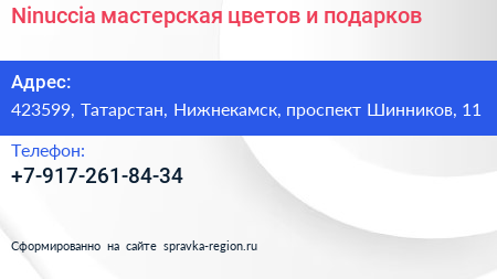 Ninuccia, мастерская цветов и подарков по адресу 423599, Татарстан, Нижнекамск, проспект Шинников, 11 в дальнейшем Организация, размещена в следующих категориях: