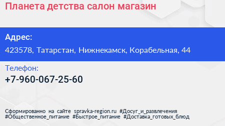 Планета детства, салон-магазин по адресу 423578, Татарстан, Нижнекамск, Корабельная, 44 в дальнейшем Организация, размещена в следующих категориях: