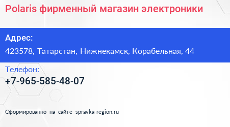 Polaris, фирменный магазин электроники по адресу 423578, Татарстан, Нижнекамск, Корабельная, 44 в дальнейшем Организация, размещена в следующих категориях: