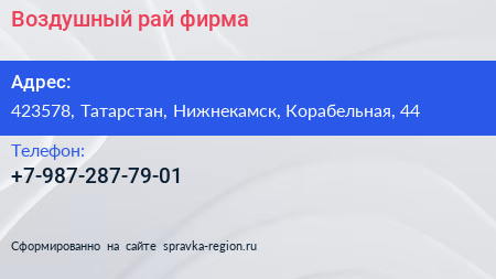 Воздушный рай, фирма по адресу 423578, Татарстан, Нижнекамск, Корабельная, 44 в дальнейшем Организация, размещена в следующих категориях: