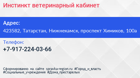 Инстинкт, ветеринарный кабинет по адресу 423582, Татарстан, Нижнекамск, проспект Химиков, 100а в дальнейшем Организация, размещена в следующих категориях: