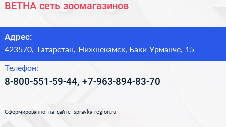 ВЕТНА, сеть зоомагазинов по адресу 423570, Татарстан, Нижнекамск, Баки Урманче, 15 в дальнейшем Организация, размещена в следующих категориях: