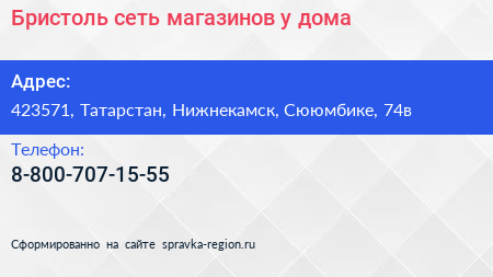 Бристоль, сеть магазинов у дома по адресу 423571, Татарстан, Нижнекамск, Сююмбике, 74в в дальнейшем Организация, размещена в следующих категориях: