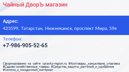Чайный ДворЪ, магазин по адресу 423599, Татарстан, Нижнекамск, проспект Мира, 59е в дальнейшем Организация, размещена в следующих категориях: