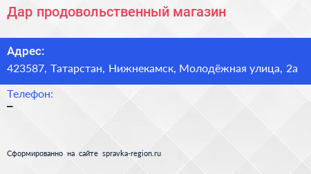 Дар, продовольственный магазин по адресу 423587, Татарстан, Нижнекамск, Молодёжная улица, 2а в дальнейшем Организация, размещена в следующих категориях: