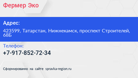 Фермер Эко по адресу 423599, Татарстан, Нижнекамск, проспект Строителей, 68Б в дальнейшем Организация, размещена в следующих категориях: