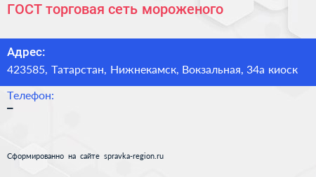 ГОСТ, торговая сеть мороженого по адресу 423585, Татарстан, Нижнекамск, Вокзальная, 34а киоск в дальнейшем Организация, размещена в следующих категориях: