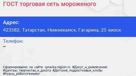 ГОСТ, торговая сеть мороженого по адресу 423582, Татарстан, Нижнекамск, Гагарина, 25 киоск в дальнейшем Организация, размещена в следующих категориях: