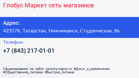 Глобус Маркет, сеть магазинов по адресу 423578, Татарстан, Нижнекамск, Студенческая, 8в в дальнейшем Организация, размещена в следующих категориях: