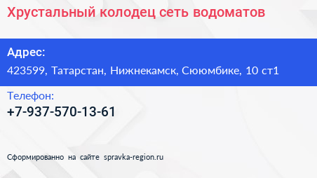Хрустальный колодец, сеть водоматов по адресу 423599, Татарстан, Нижнекамск, Сююмбике, 10 ст1 в дальнейшем Организация, размещена в следующих категориях: