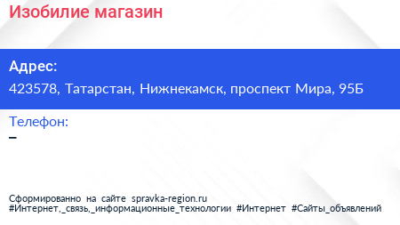 Изобилие, магазин по адресу 423578, Татарстан, Нижнекамск, проспект Мира, 95Б в дальнейшем Организация, размещена в следующих категориях: