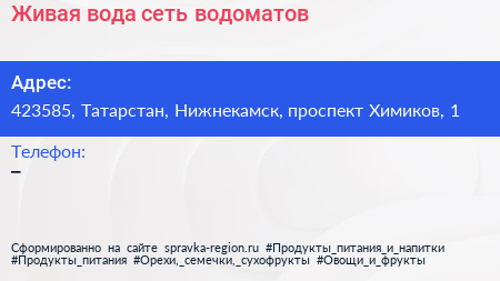 Живая вода, сеть водоматов по адресу 423585, Татарстан, Нижнекамск, проспект Химиков, 1 в дальнейшем Организация, размещена в следующих категориях: