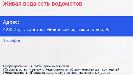 Живая вода, сеть водоматов по адресу 423575, Татарстан, Нижнекамск, Тихая аллея, 9а в дальнейшем Организация, размещена в следующих категориях: