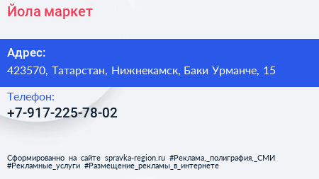 Йола-маркет по адресу 423570, Татарстан, Нижнекамск, Баки Урманче, 15 в дальнейшем Организация, размещена в следующих категориях: