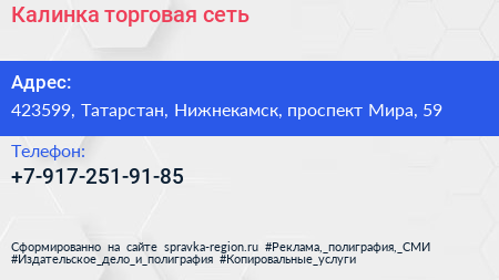 Калинка, торговая сеть по адресу 423599, Татарстан, Нижнекамск, проспект Мира, 59 в дальнейшем Организация, размещена в следующих категориях: