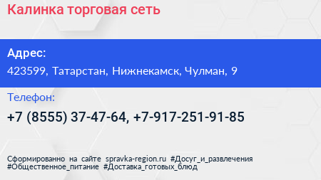 Калинка, торговая сеть по адресу 423599, Татарстан, Нижнекамск, Чулман, 9 в дальнейшем Организация, размещена в следующих категориях: