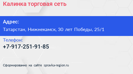 Калинка, торговая сеть по адресу Татарстан, Нижнекамск, 30 лет Победы, 25/1 в дальнейшем Организация, размещена в следующих категориях: