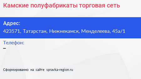 Камские полуфабрикаты, торговая сеть по адресу 423571, Татарстан, Нижнекамск, Менделеева, 45а/1 в дальнейшем Организация, размещена в следующих категориях: