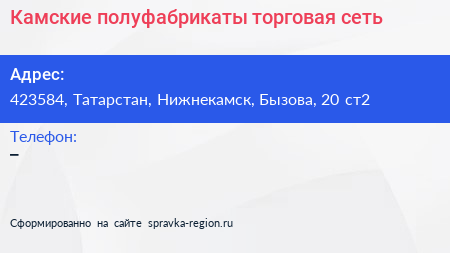 Камские полуфабрикаты, торговая сеть по адресу 423584, Татарстан, Нижнекамск, Бызова, 20 ст2 в дальнейшем Организация, размещена в следующих категориях: