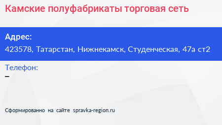 Камские полуфабрикаты, торговая сеть по адресу 423578, Татарстан, Нижнекамск, Студенческая, 47а ст2 в дальнейшем Организация, размещена в следующих категориях: