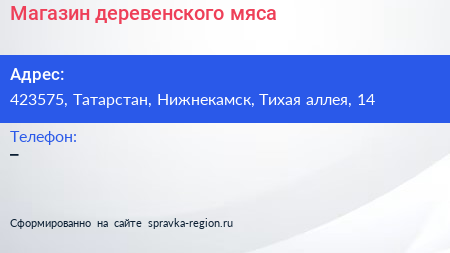 Магазин деревенского мяса по адресу 423575, Татарстан, Нижнекамск, Тихая аллея, 14 в дальнейшем Организация, размещена в следующих категориях: