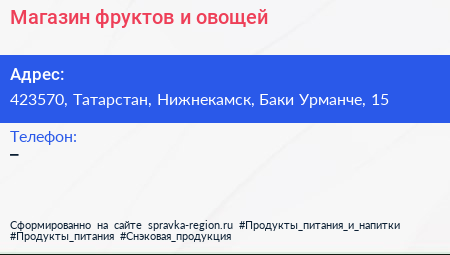 Магазин фруктов и овощей по адресу 423570, Татарстан, Нижнекамск, Баки Урманче, 15 в дальнейшем Организация, размещена в следующих категориях: