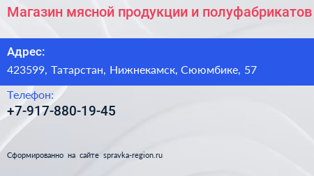 Магазин мясной продукции и полуфабрикатов по адресу 423599, Татарстан, Нижнекамск, Сююмбике, 57 в дальнейшем Организация, размещена в следующих категориях: